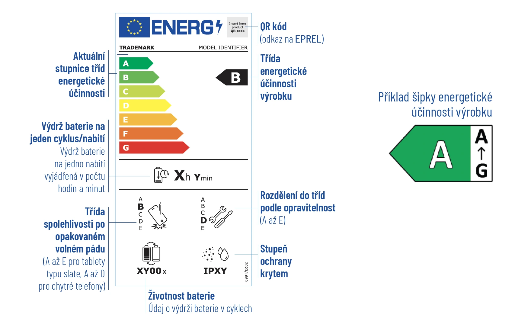 - Energetickou třídu (A až G) – hodnocení výdrže baterie na základě testů při běžném používání